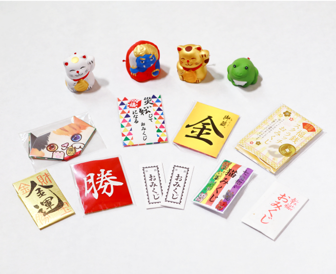 紙のもの、小物がついたもの、陶器の人形型のものなどをお選びいただけます。ペット用のおみくじもございます。